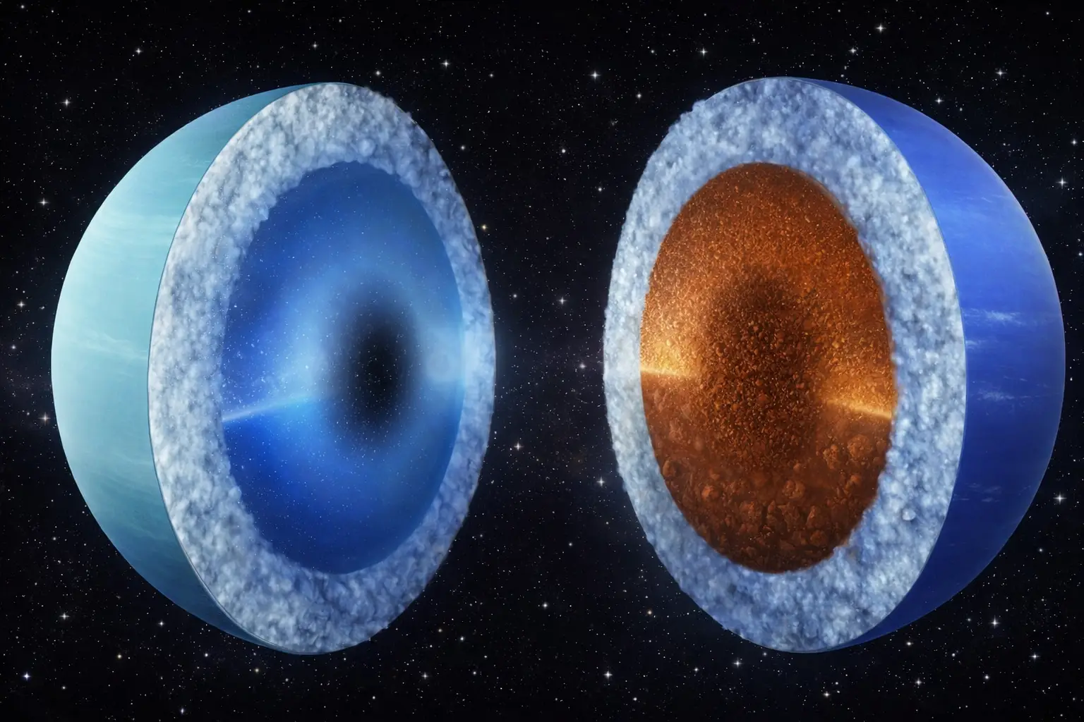 Nowe analizy wnętrz Urana i Neptuna sugerują, że te planety mogą mieć bardziej skaliste, a mniej „lodowe” środki, niż dotąd sądzono. To rzadki wyjątek od prostego podziału, według którego dalekie olbrzymy uznaje się za „lodowe”, bo powinny gromadzić głównie wodę i inne lotne związki w postaci lodów.